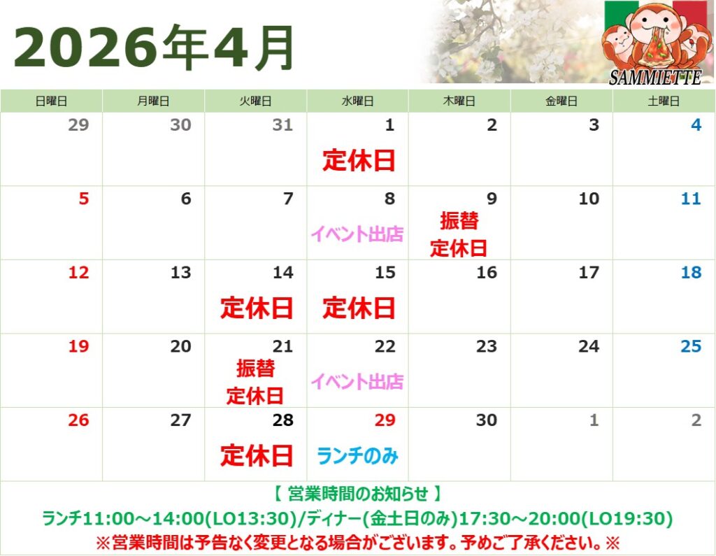 Welcome to SAMMIETTE! 2024.12.102025.01.03 埼玉県熊谷市で営むイタリアンレストランです。 窯焼きナポリピッツァをお召し上がりいただけます。 ご注文をお受けしてから生地を伸ばし、トッピング。 450℃の高温の窯で丁寧に焼き上げます。 焼きたて熱々のナポリピザを是非ご堪能ください。 (写真は定番メニューのマルゲリータ) パスタのご用意もあります。 (画像は豚挽き肉と長ネギのペペロンチーノ) 店内 席数20席(テーブル14席 カウンター6席) 営業時間